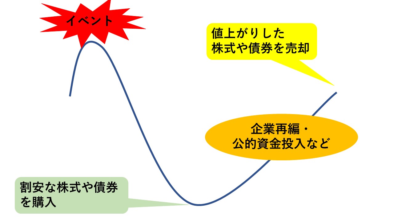 具体的には、企業再編後で再建中の企業や、多額の損害賠償で倒産寸前の企業にヘッジファンドが目をつけます。これらの企業の株式を割安な価格で手に入れ、その後再建して値上がりしたところで売り、多額の利益を得ます。