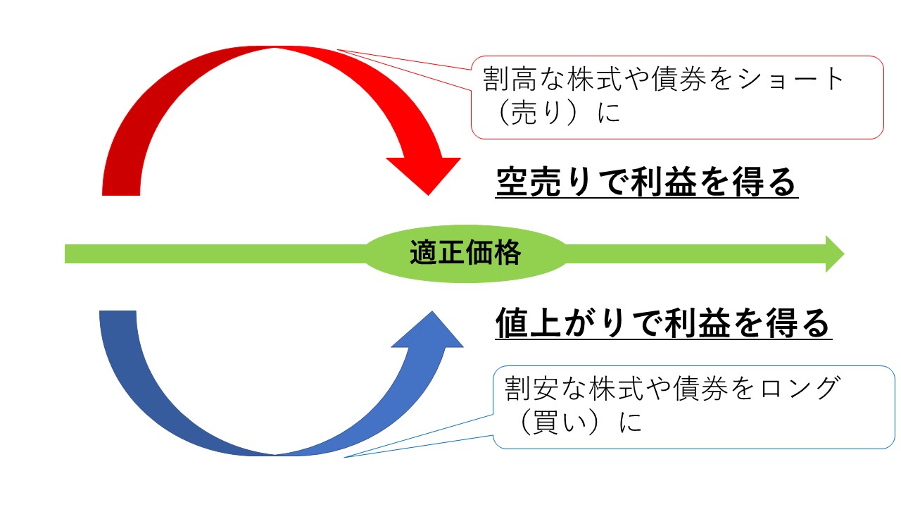 具体的には、割高な債券は適正価格への値下がりを期待して空売りします。一方で割安な債券は、適正価格への値上がりを期待して買いを入れるのです。