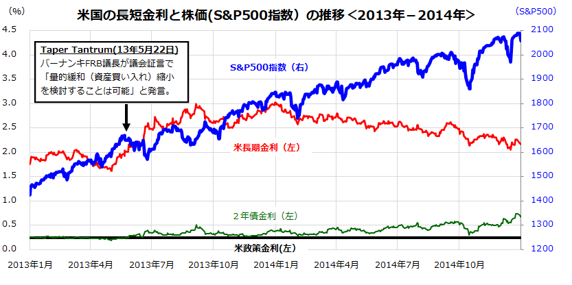<図表3:「バーナンキ・ショック」と米国株価の推移> 出所:Bloombergより楽天証券経済研究所作成(2013年初~2014年末)